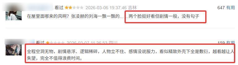 网友直言“老戏骨带不动两个木头人”,看剧全靠快进主角戏份,弃剧声一波接一波。